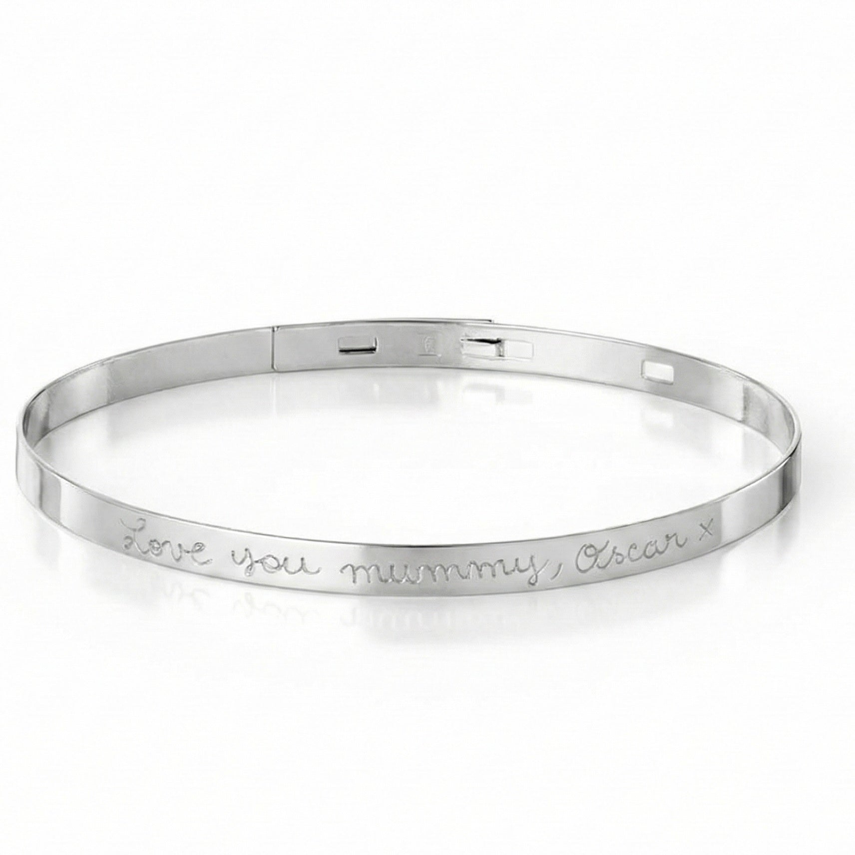 Il bracciale nella foto è realizzato in argento 925 anallergico ed è caratterizzato da una chiusura a cinturino, che permette di regolarne la misura in modo semplice ed elegante. Il design del bracciale è sottile e minimalista, con una finitura lucida. Sul bracciale è presente un'incisione personalizzabile; nella foto è visibile la scritta "Love you mummy, Oscar x". Questo tipo di bracciale è ideale per fare regali personalizzati, permettendo di incidere messaggi speciali, nomi o date importanti, rendendolo un accessorio significativo e unico.