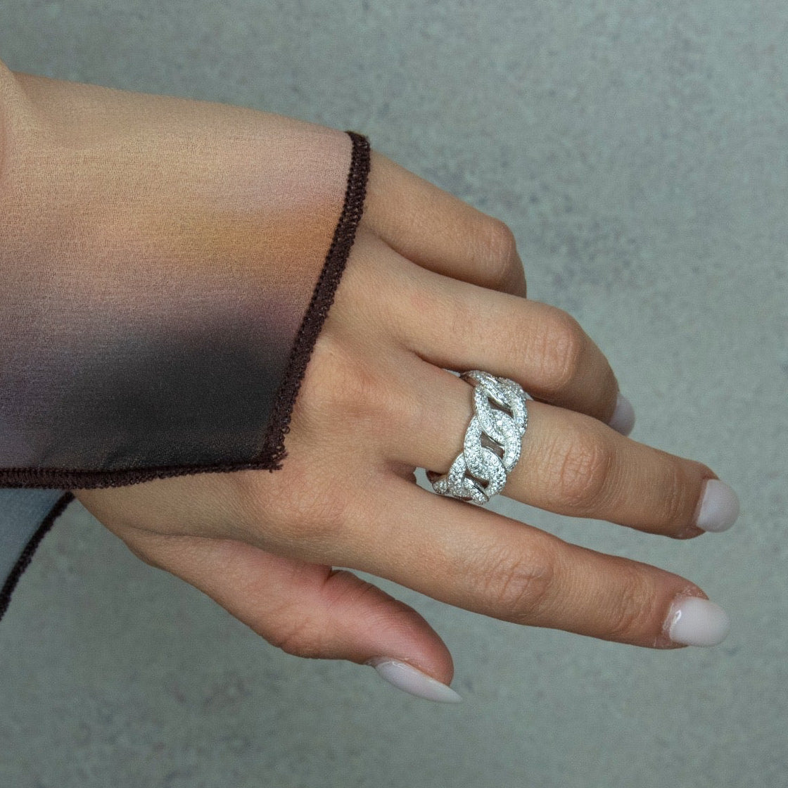 L’anello Groumette large è un gioiello elegante e moderno in argento 925, caratterizzato da una maglia intrecciata che avvolge il dito con un design deciso. La fascia è completamente tempestata di zirconi, piccole pietre scintillanti che ne decorano tutta la circonferenza. I zirconi, disposti con cura, riflettono la luce, creando un effetto brillante e luminoso, e conferiscono all’anello un aspetto raffinato e sofisticato.