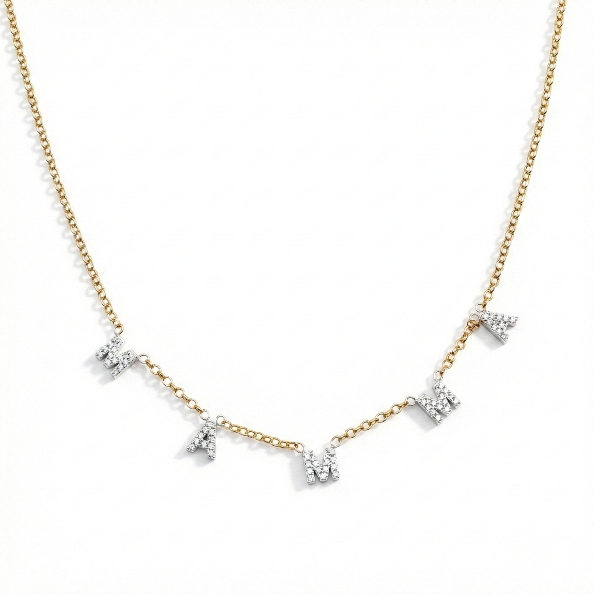 Collana “La Mamma è”, un gioiello che racconta amore in ogni dettaglio. Realizzata interamente nel nostro laboratorio orafo, la catenina rolò in argento 925 placcato oro si distingue per la sua raffinatezza, al centro la parola “mamma” prende vita attraverso letterine in argento 925 pavé di zirconi bianchi, luminose e femminili. Ogni lettera è saldata a laser e disposta con una distanza armoniosa di 1,5 cm, per creare un effetto leggero ma ricercato, sospeso sul décolleté come un pensiero d’amore. Un gioiello pensato per essere indossato ogni giorno o donato in un momento speciale.