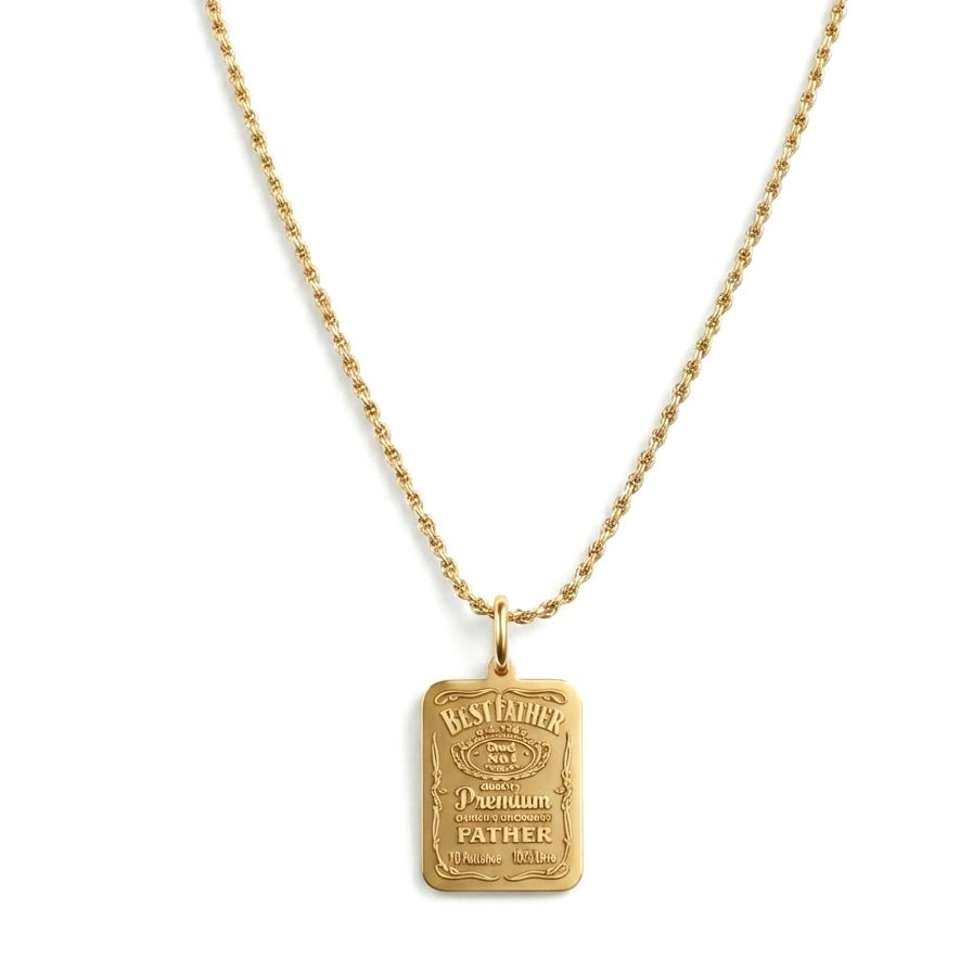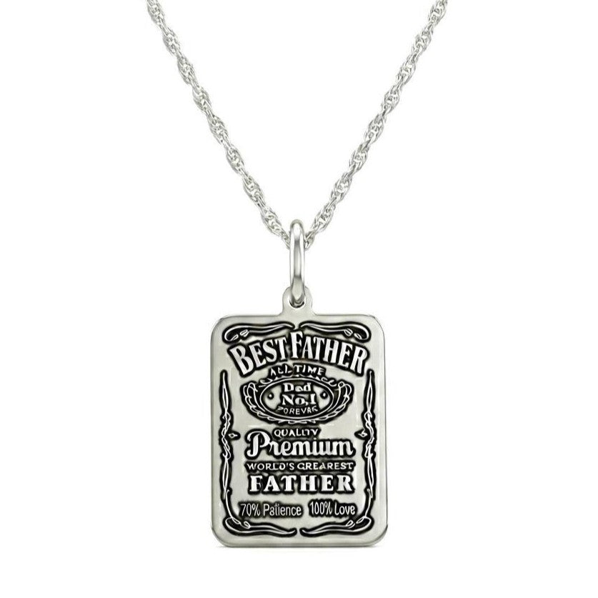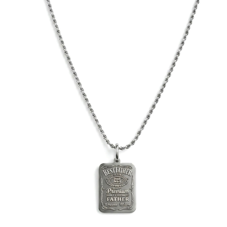 La collana Best Father è in Argento 925, con catenina in maglia funetta, che conferisce un aspetto raffinato e moderno. Al centro della collana pende una targhetta rettangolare, dalla superficie liscia e ben definita, su cui è incisa con eleganza una rivisitazione dell’ iconica etichetta del Jack Daniels. L’incisione è profonda e ben visibile, creando un contrasto delicato con la lucentezza dell’argento. Questa collana, semplice ma carica di significato, è perfetta per celebrare l’affetto e l’ammirazione verso un padre speciale.